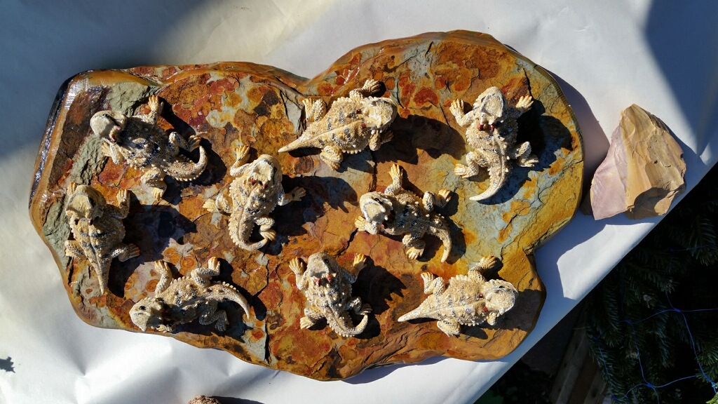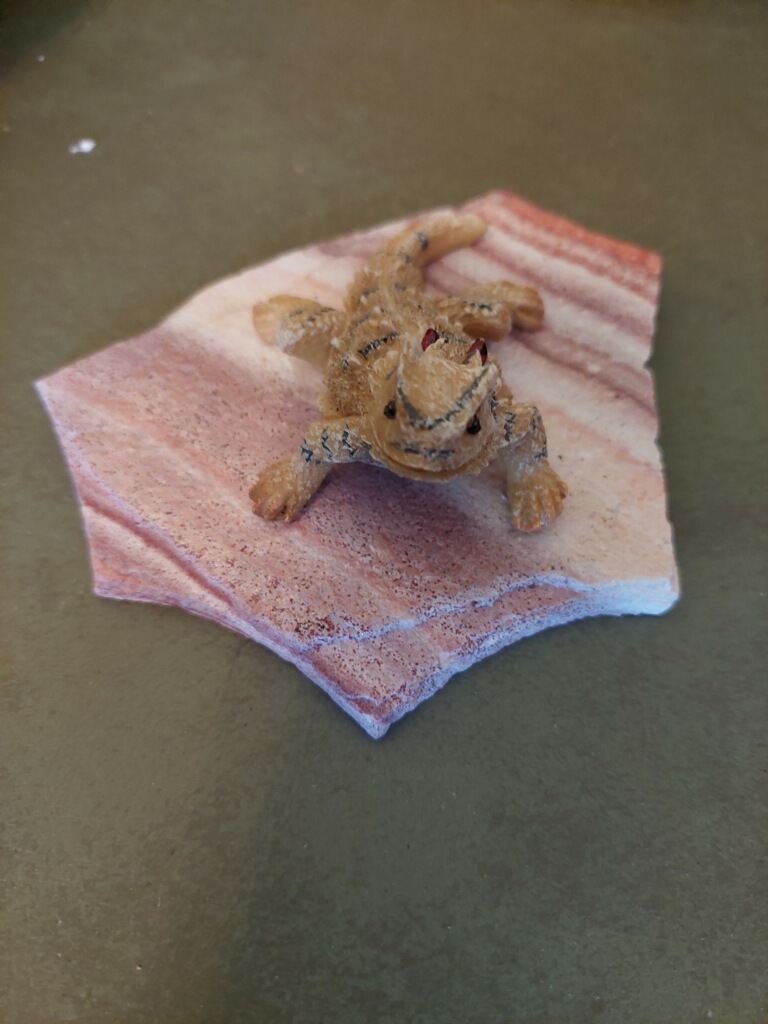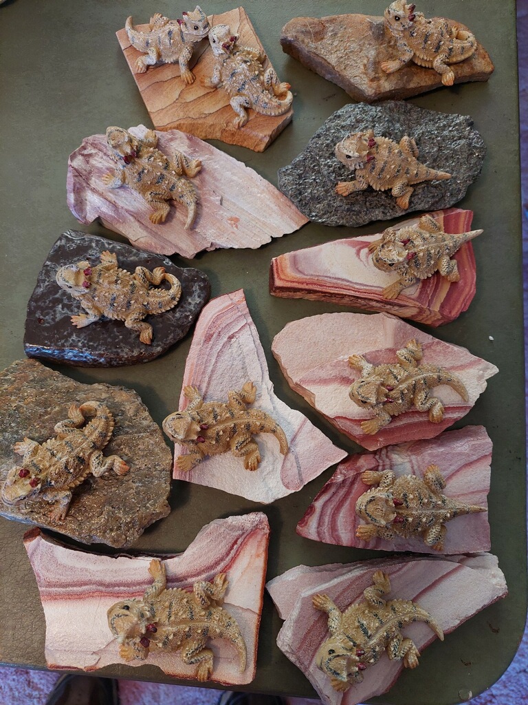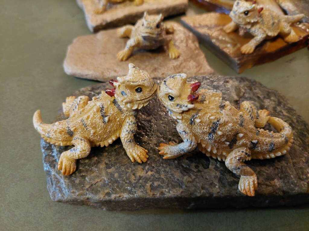 Paperweights are hand made with hand-molded and hand-painted resin horned toads attached to real stone. You may select Candy Rock stone or Lampasas stone (see examples of stone in cross order pictures). Each single horned toad comes with his own cowboy name and doubles feature famous couple names. Single horned toads are $12.50 plus shipping. Doubles (kissing couples) are $24.50 plus shipping.